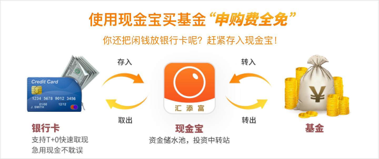 通过现金宝专享通道,使用工、农、建、招商等十数家银行卡申购、定投汇添富基金,申购费一律为 0。